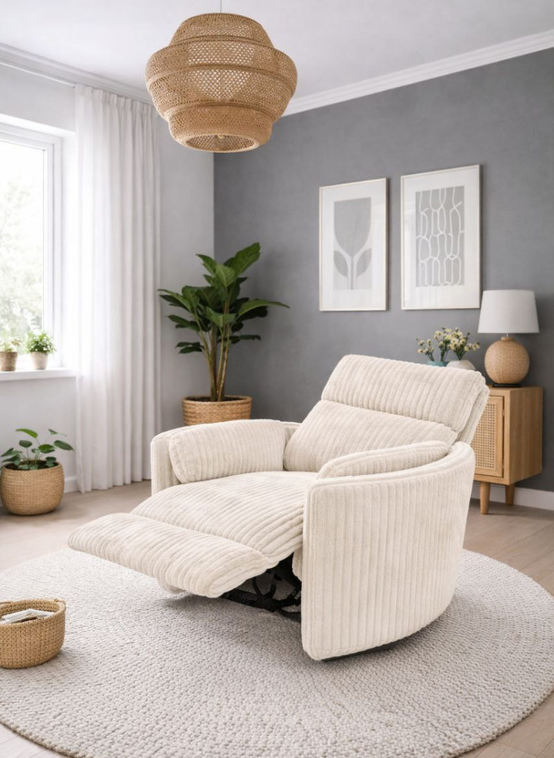 Крісло-реклайнер Bono від Ovalbed – це комфорт, стиль і функціональність в одному. Ідеальне рішення для релаксації, годування малюка, заколисування чи відпочинку після насиченого дня. Доступне з механічним або електричним реклайнером, має функцію гойдання та регульовані положення. Якісна тканина на вибір, плавне й безшумне розкладання – усе для вашого затишку.